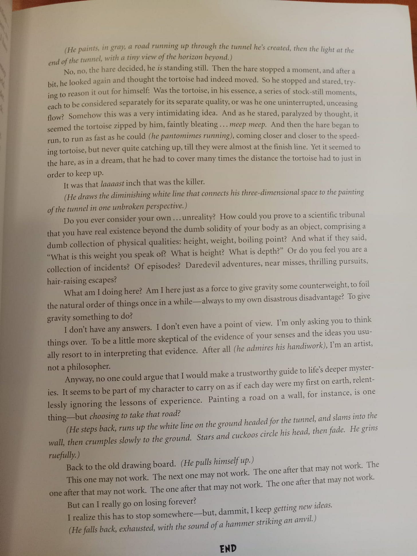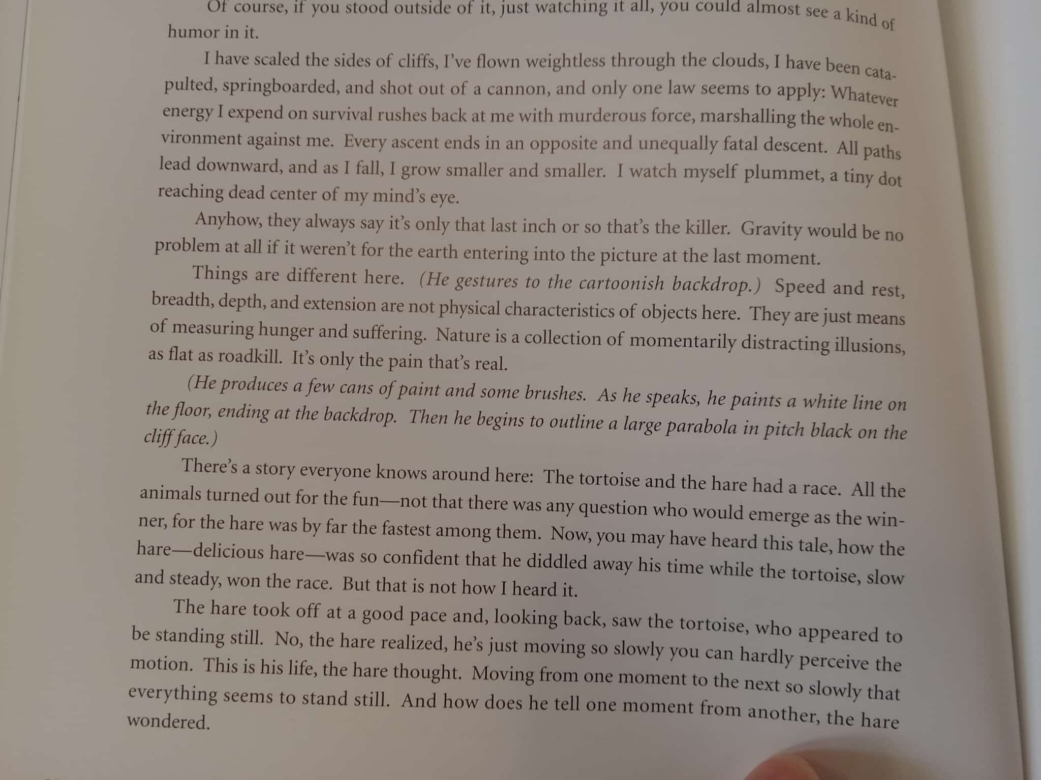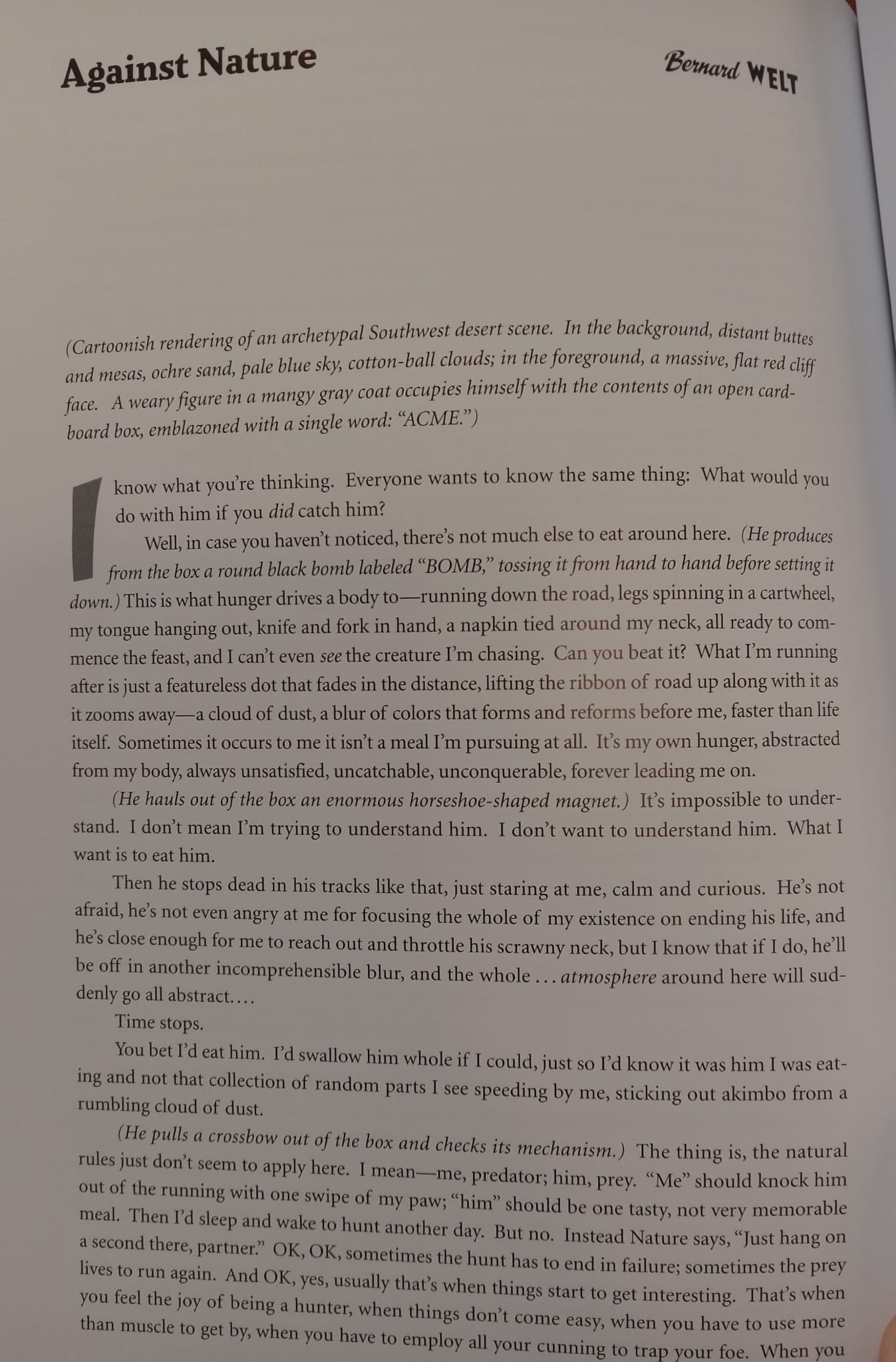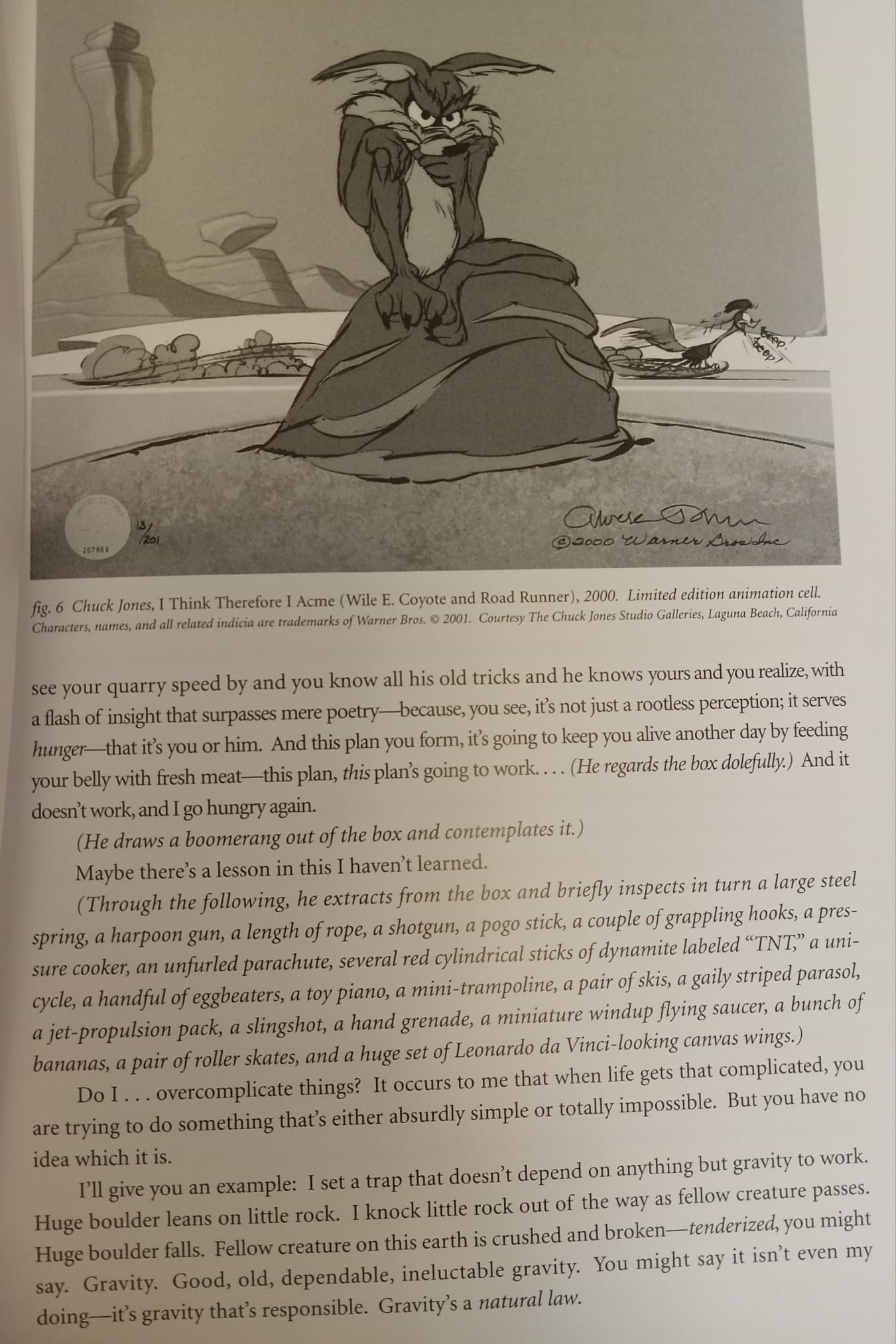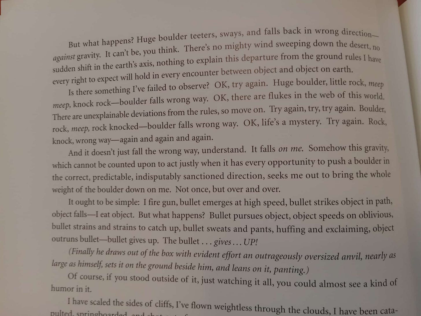 But I think my favorite thing he wrote appears in a 2003 edited volume about cartoons. It’s cute little monologue from the perspective of Wile E. Coyote. If you wanted to get Serious, you could say Welt puts in Wile E. in conversation with Huysmans (the title of the essay nods to the English title of A Rebours), Shestov (“all things are possible” & parable of the pike), Camus (the myth of Sisyphus), Zeno (the paradoxes of motion), and Beckett (the end of the piece, with its short grim determined repetitive sentences on resolute persistence despite existential futility could be out of one of the Three Novels)—but in such a silly, light way you can ignore how smart this confection is. I yearn for such sprezzatura!