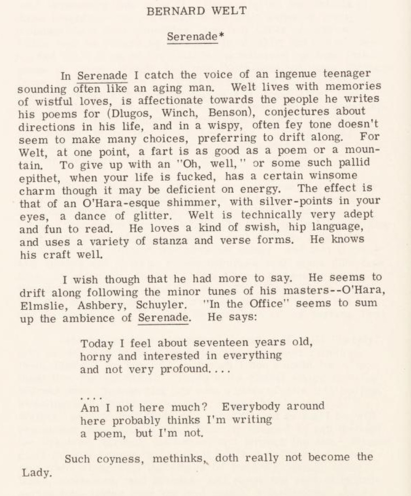 The gay poetry critic Robert Peters, in a 1980 review of one of Welt’s books of poems, names his gay influences (“masters”) and peers (“loves”)—and calls him a “swish… shimmer… glitter… Lady.” Well, as Renee Rapp says, the more gay you are, the more homophobic you become (my ignorant gay ass, by the way, only recently read Schuyler’s The Morning of the Poem (1980) which is astonishingly explicit in its gayness, and so astonishingly good).