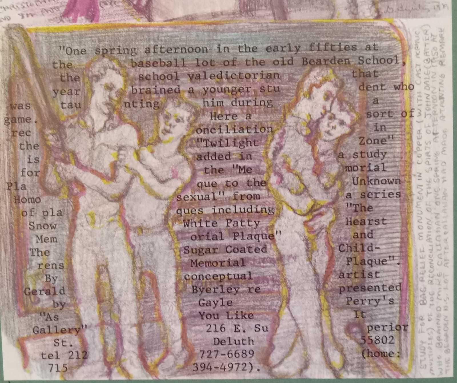 We’re told “John Dale” and “Mike Callahan” are “types” for the figures to be appear in the study/photo/plaque/monument. “John Dale” is in pink, wearing make-up, which is presumably what enraged “Mike Callahan.” In the monument, the two embrace. Thus for some reason and somehow the Monument to the Unknown Homosexual is to be a “reconciliation” of “batter and victim” in what Byerley calls, with quotes, a “ ‘spiritual world’ … ‘Twilight Zone’.”