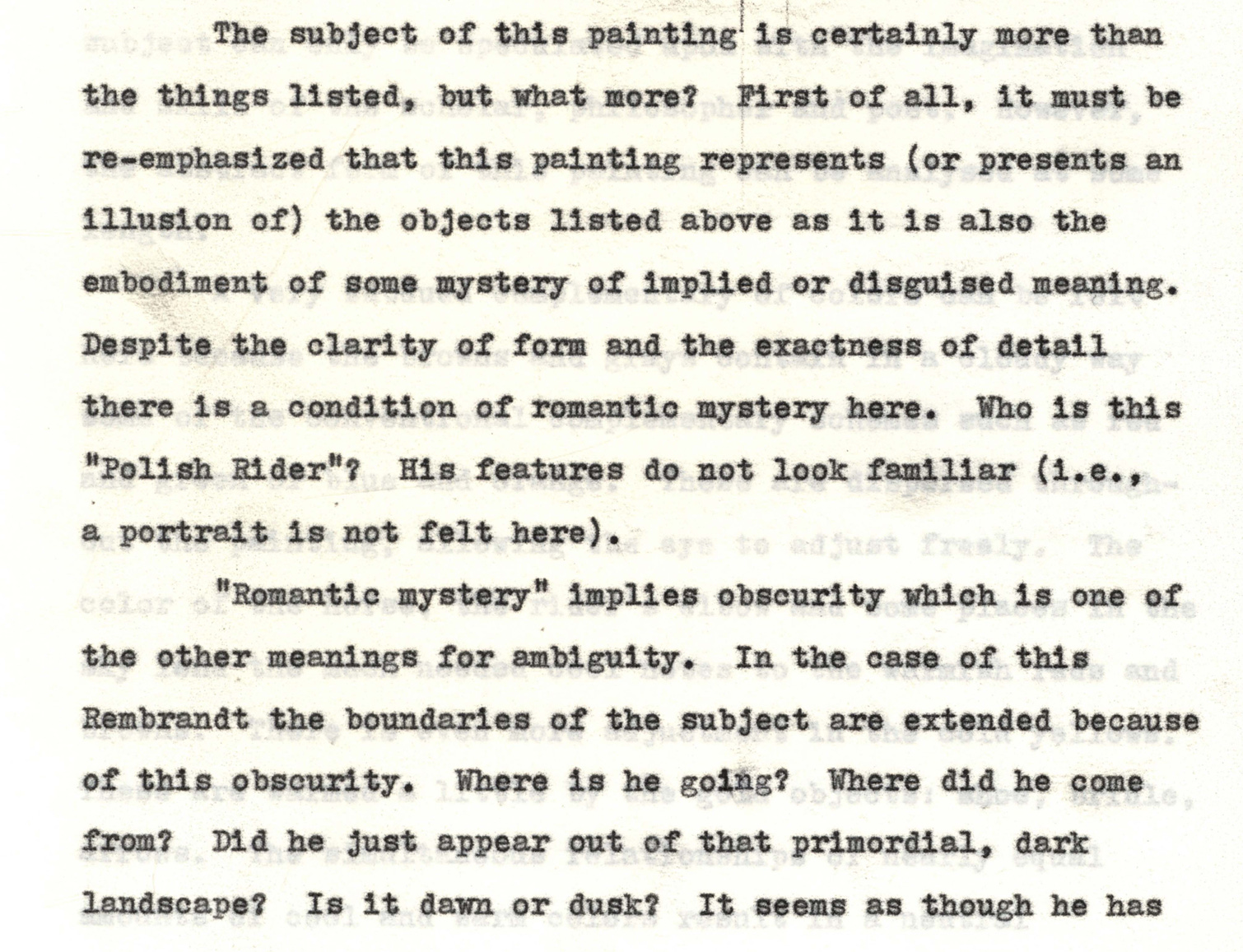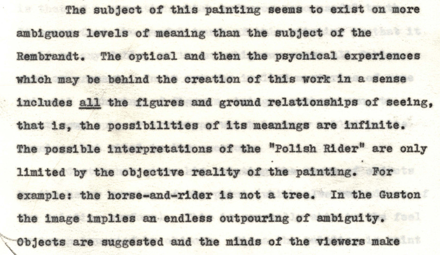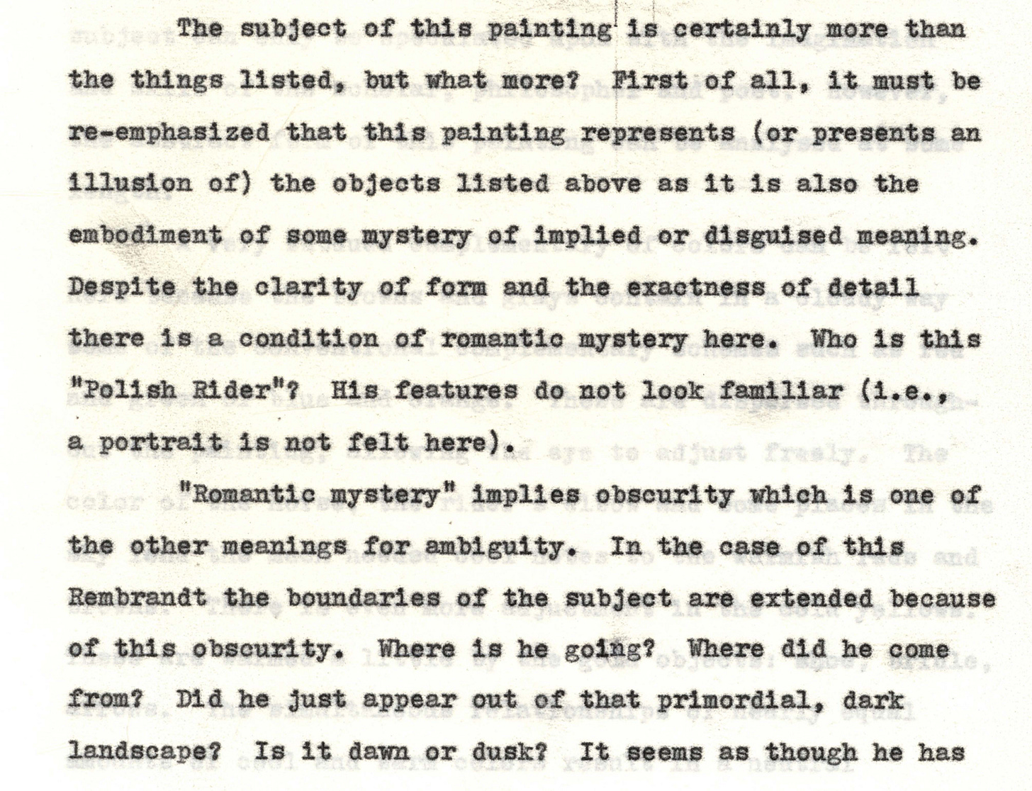 He starts with an interpretation of Rembrandt’s “Polish Rider,” to argue that art was highly ambiguous and mysterious even before it got modern and abstract: