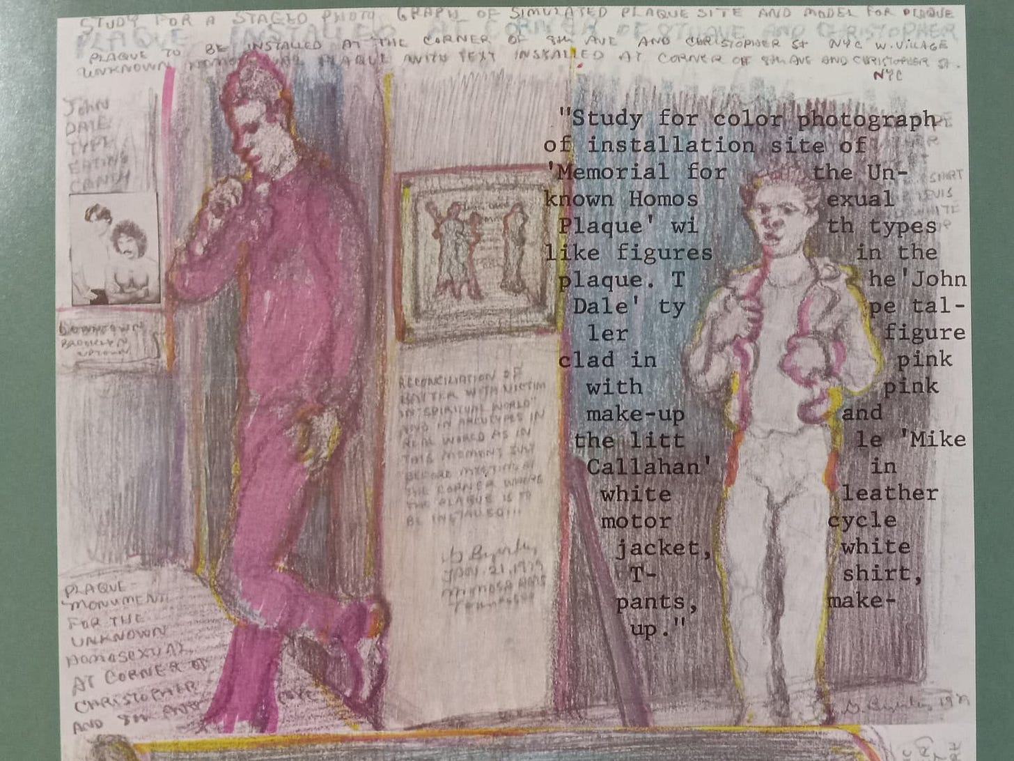 The image, we’re told, is a “study for a staged photograph of simulated plaque site and model for plaque to be installed at corner of 8th Ave and Christopher Street” dedicated to the “Unknown Homosexual.” So we’ve got a 1. a study 2. a staged photograph 3. a simulated plaque site (idk what this means) 4. a “monument” or “memorial” to be built on the basis of the plaque… or the photo… or the study?