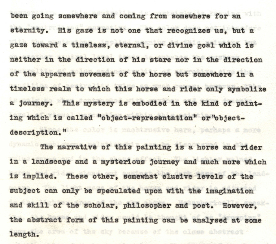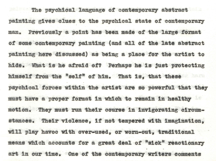 His B.F.A thesis from Washington Univerity (1960), on ambiguity in abstract art, is, however, online. What an age we live in! It’s the work of a college student, to be sure, but has some interesting ‘readings’ of a few paintings, and definitely does not suggest the kind of primitivist neo-folk madman suggested by the sketch for a plan of a draft of a plaque for a monument!