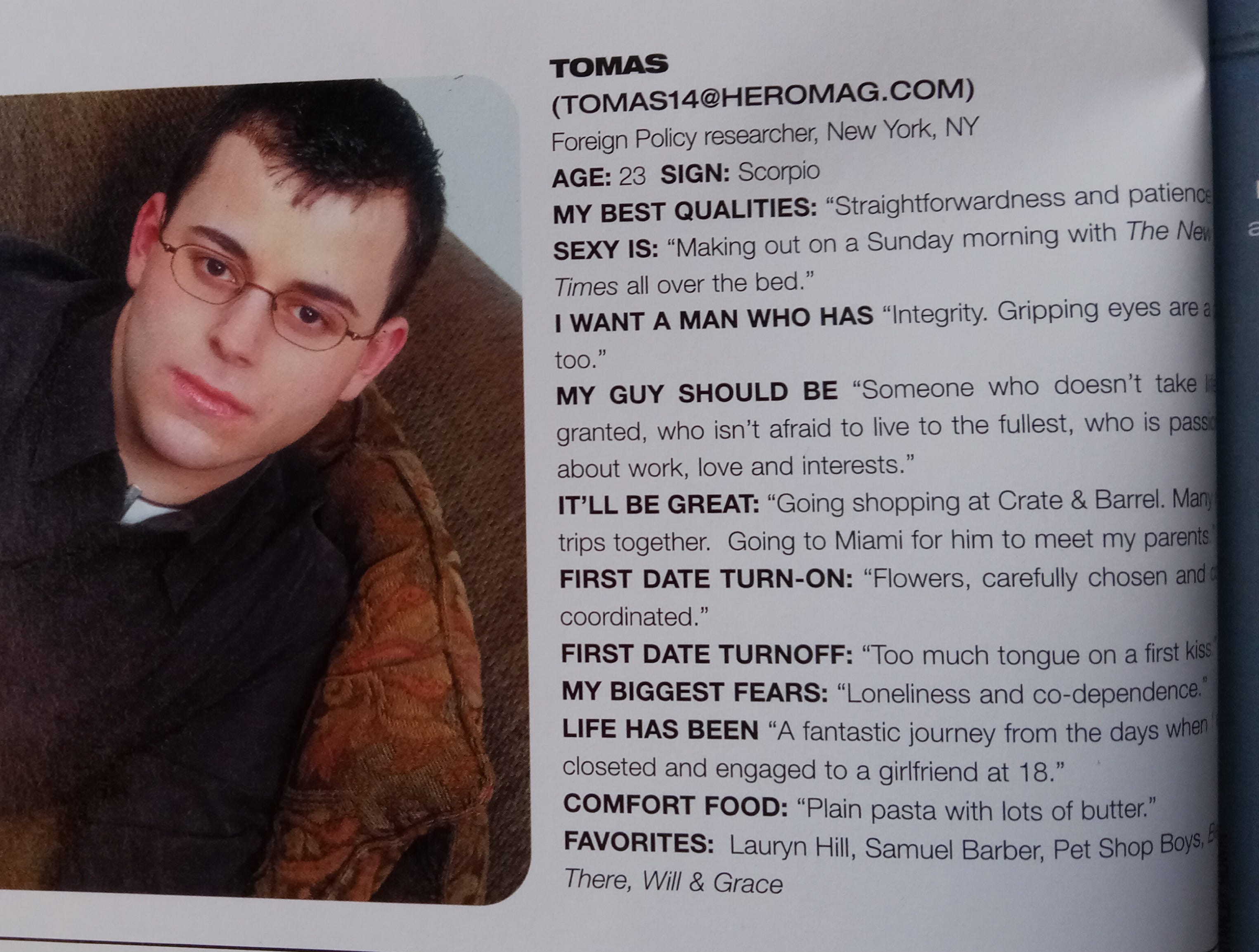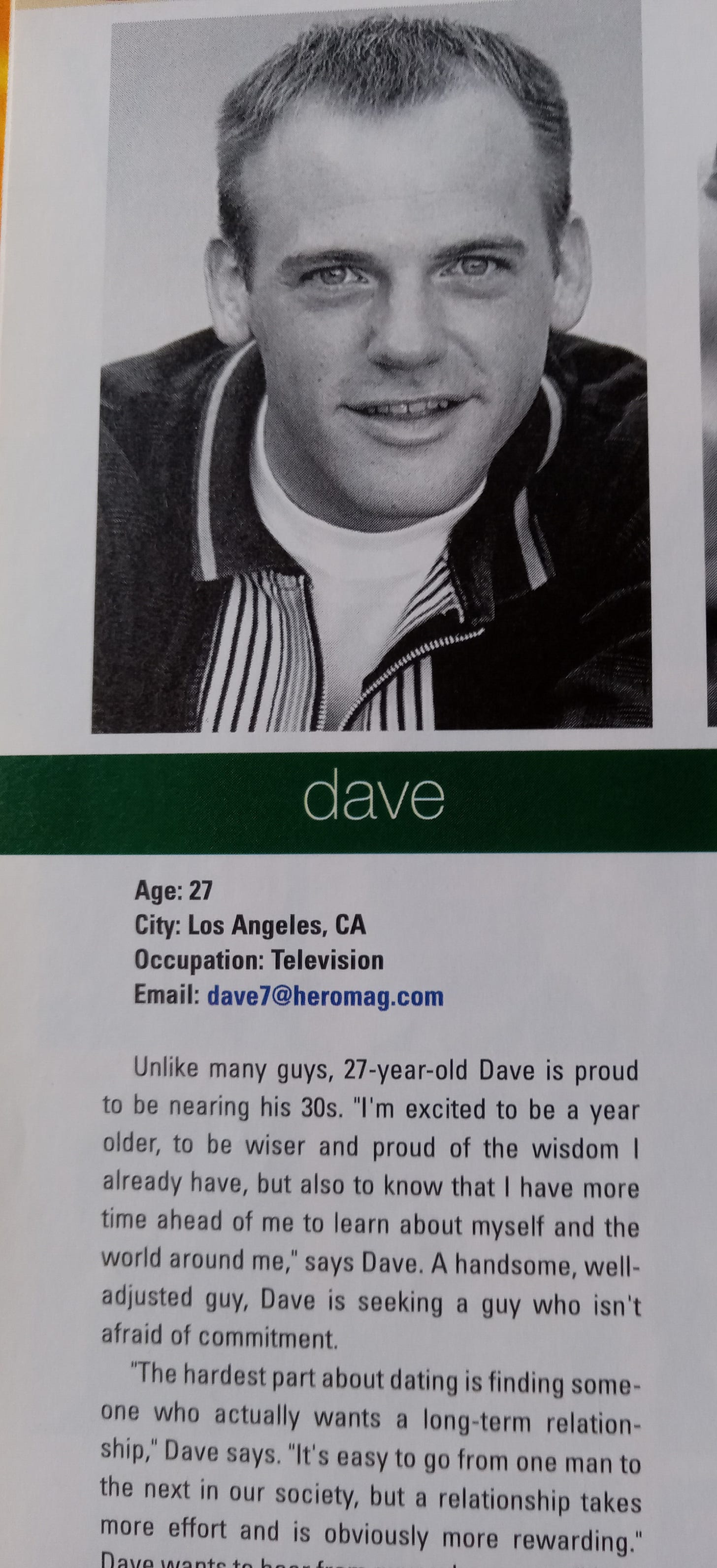 For a couple of years at the beginning of the century there was a gay men’s magazine “for the rest of us,” that is, for gay men who want monogamous relationships and don’t identify with the ‘scene.’ As you can imagine, it was really boring! Take some of their most eligible bachelors: