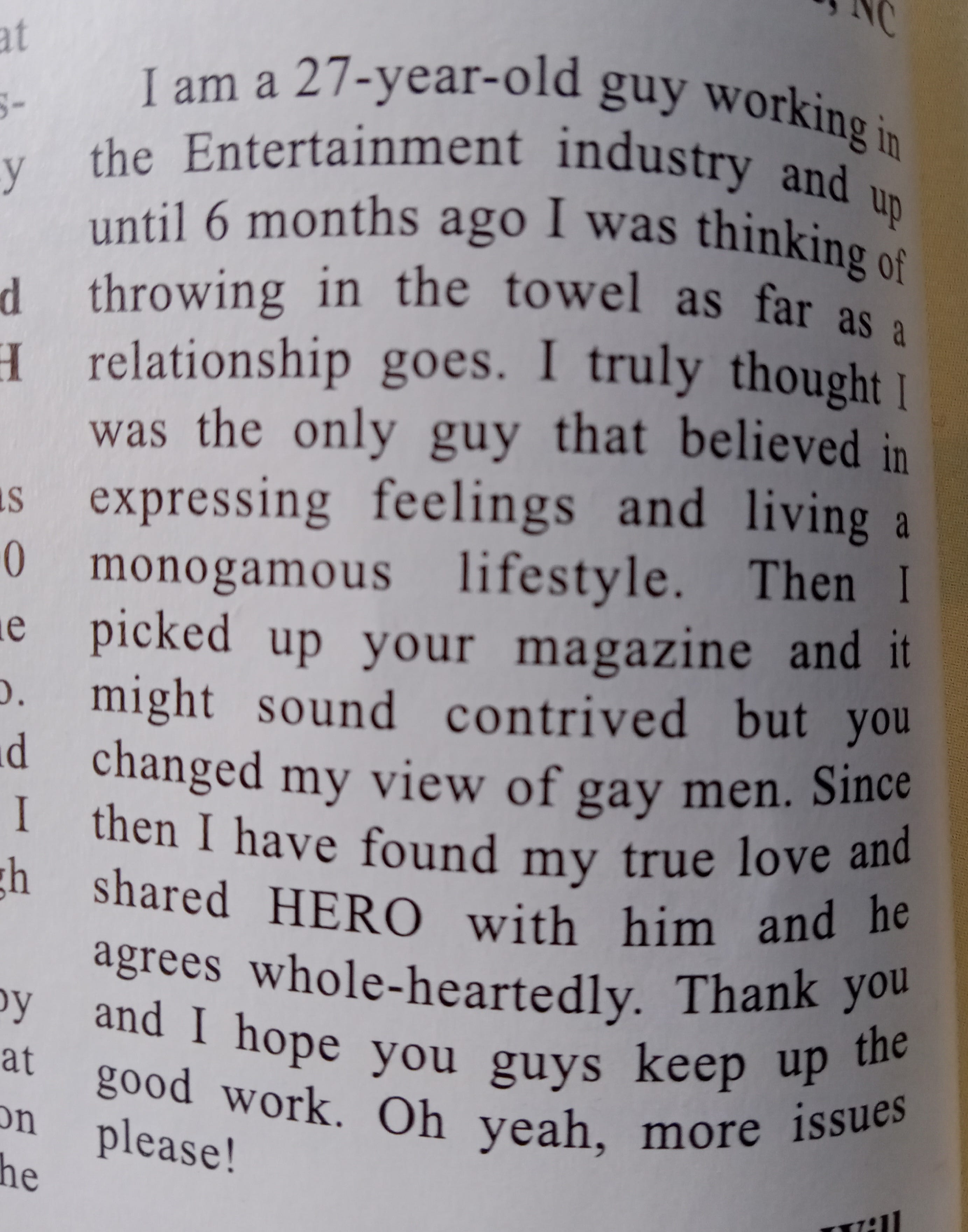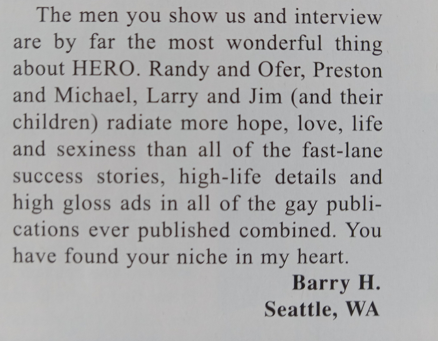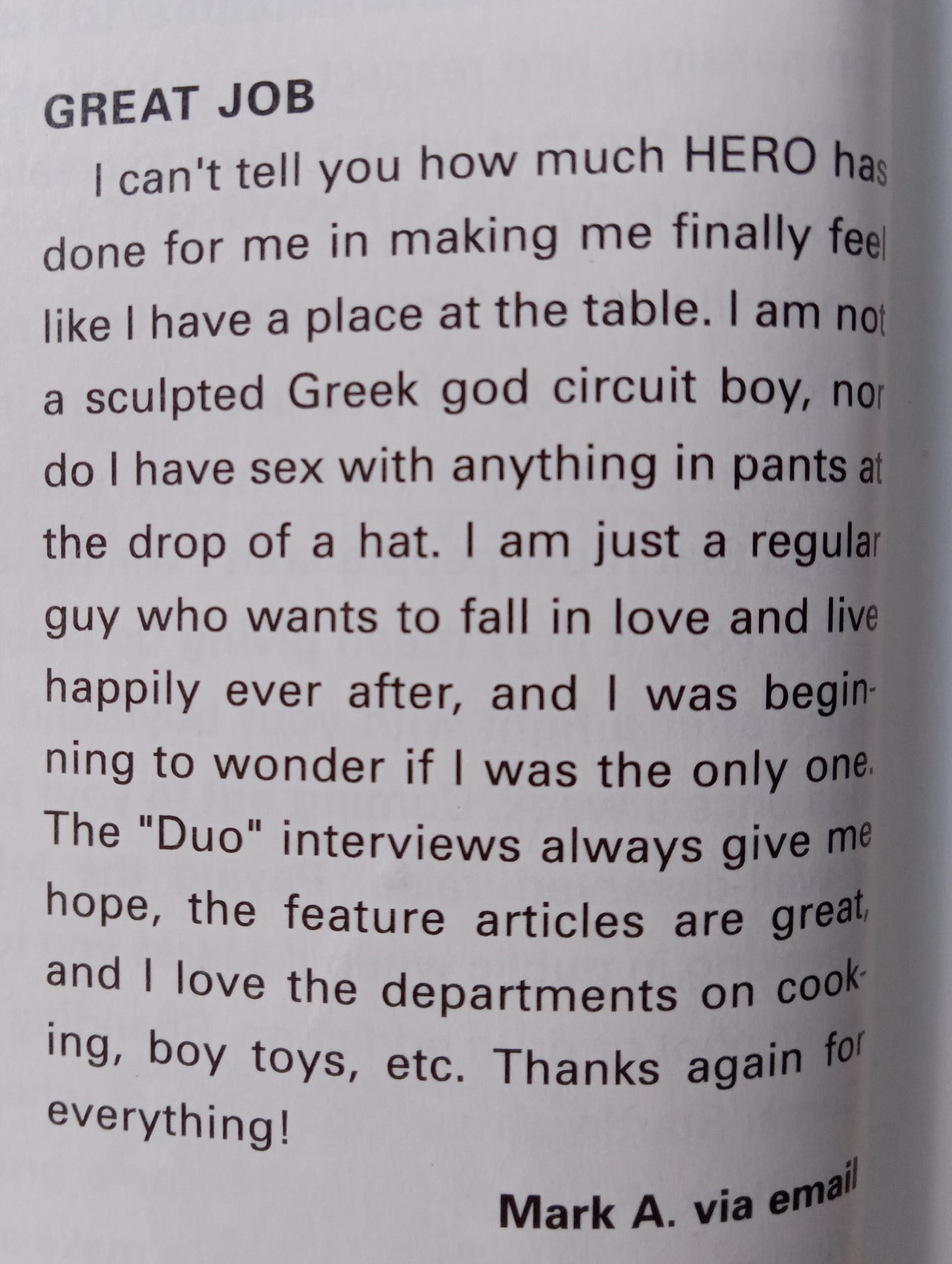 One of my 'favorite’ gay ‘content creators’ is a middle-aged guy looking for love in Chicago and speaking out for all the fellow gays who want monogamy in a culture full of shallow hedonism. He’s like Larry Kramer in Faggots, if she were a personal trainer who didn’t read Proust. And he’s always going on (from the same angle, switch it up Sean!) as if masculine-of-center ‘regular guy’ monogamy-seekers with ‘good values’ were an oppressed and lonesome minority-within-a-minority. Twenty-five years ago, guys writing into Hero felt much the same…