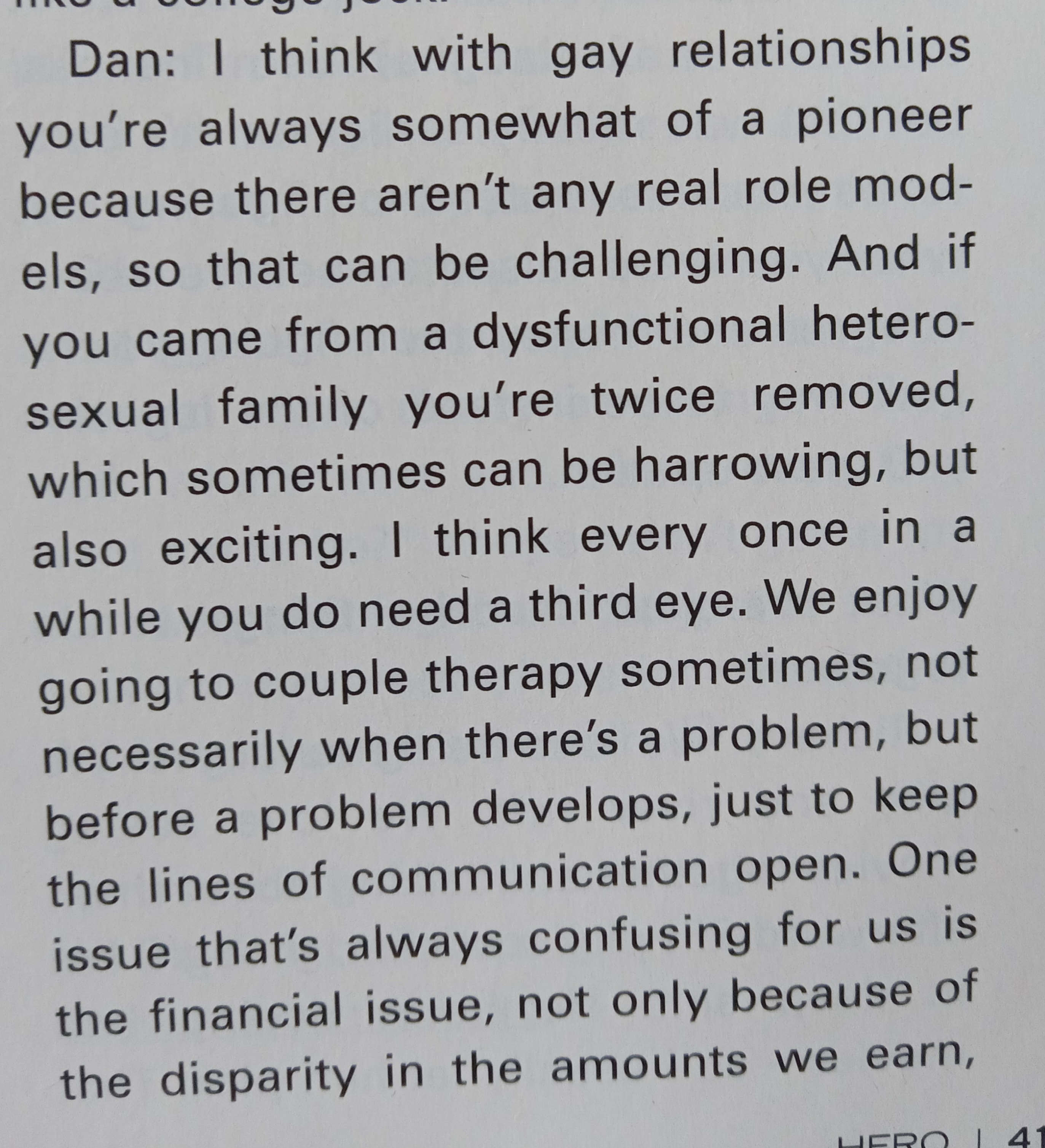 It wouldn’t hurt either, in principle, for gays in relationships to talk openly about how they manage to make it work—this was the idea Michael Denneny had in publishing Lovers and its less popular sequel Decent Passions, sharing long interviews with both halves of gay couples who were together in the late 70s and early 80s (who talked, notably, about how they negotiated things like open-ness, topping/bottoming, power dynamics, etc). But, as with Drag Race and other reality shows over the years, it seems like the ‘realness’ and possible value (or at least entertainment value) of such glimpses into ‘real life’ has been diminishing as people get more and more used to stylizing themselves in public as having just-right qualities of relatable messy-but-not-too-messiness.