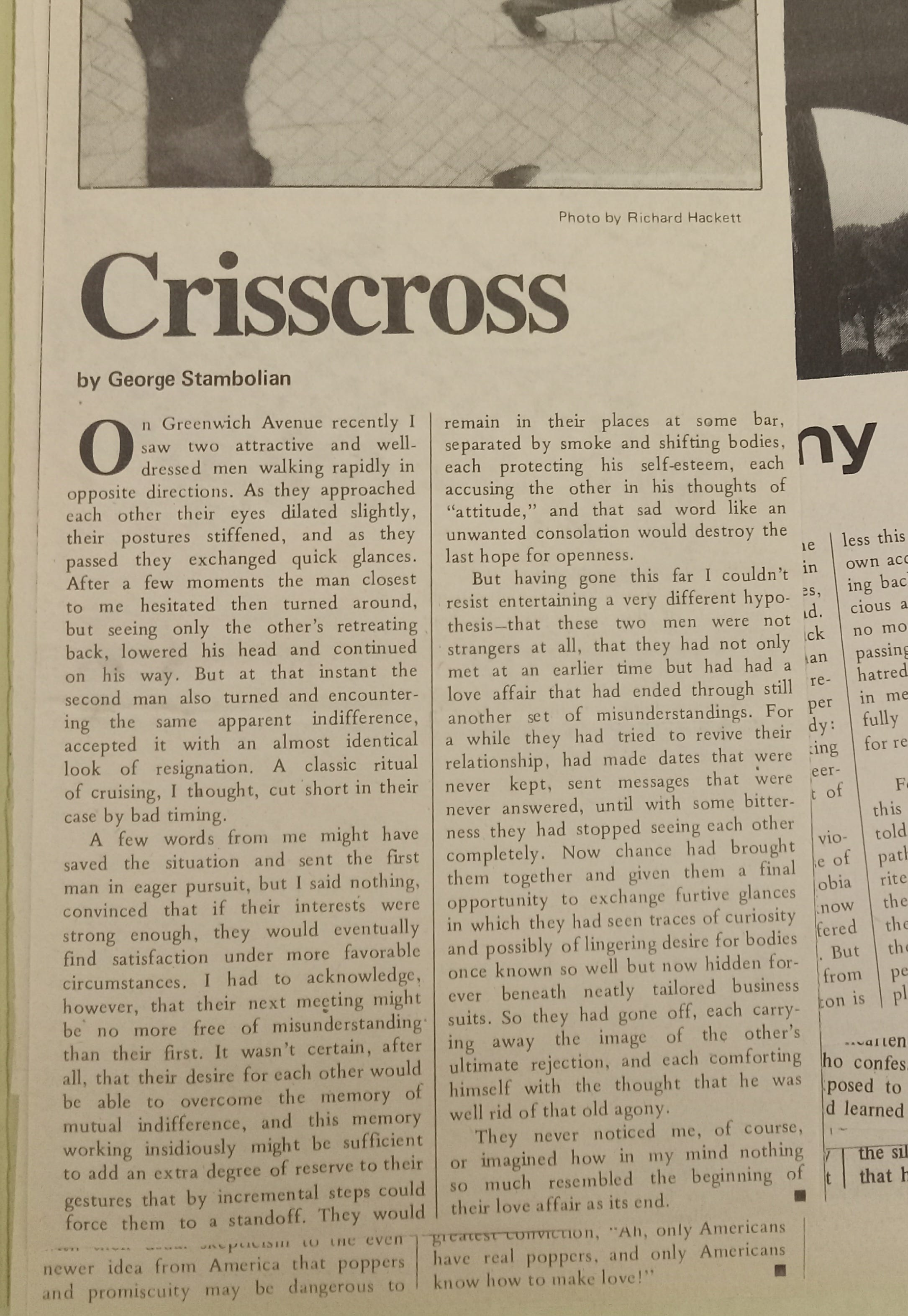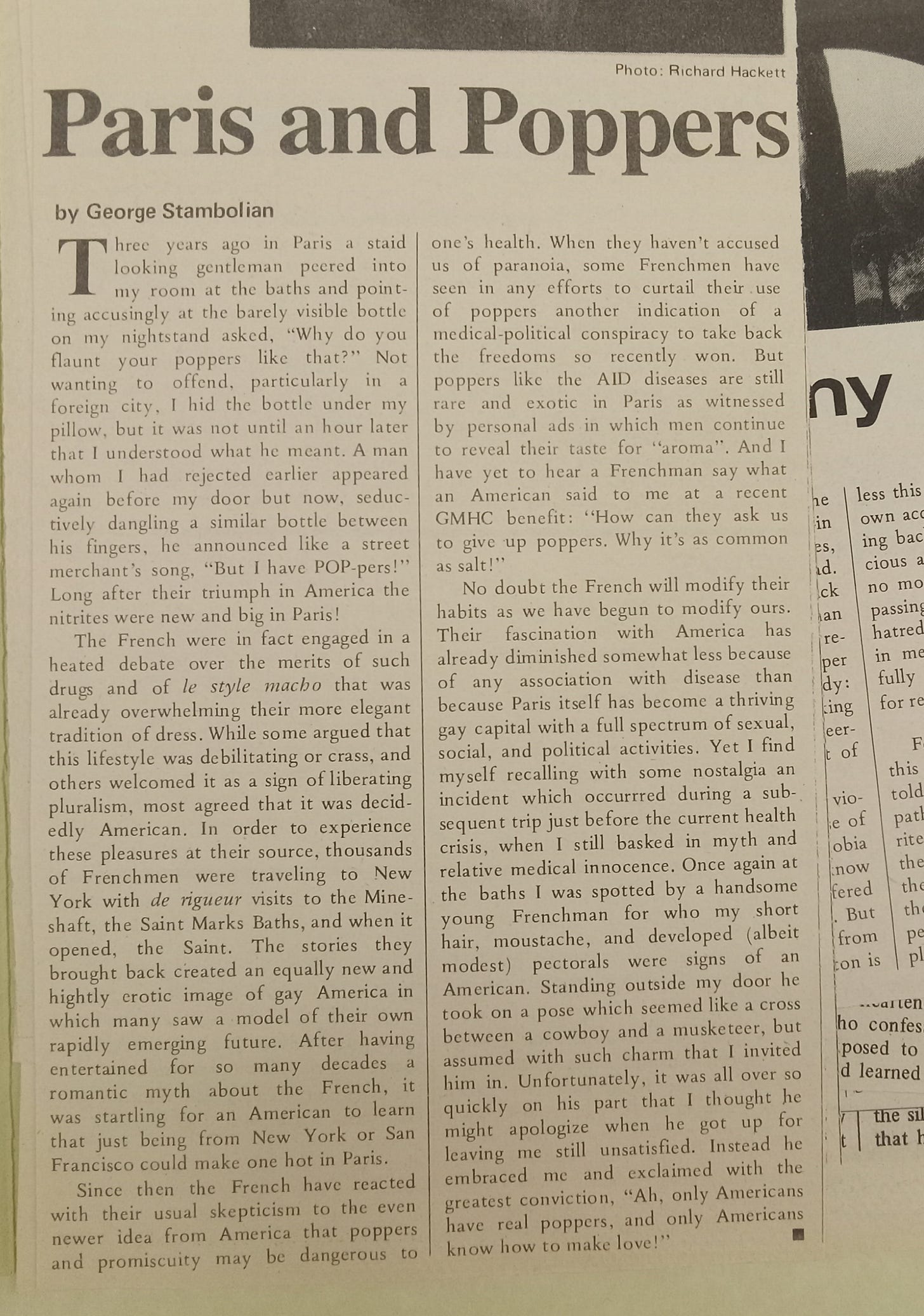 In the late 70s and early 80s, Stambolian was moving from academic studies of Proust and homosexuality in French literature/theory into a new kind of role as critic, anthologizing (and writing) new gay male fiction, interviewing representative gay male ‘types’ and starting a column in the New York Native in which he tried to become Carrie from SATC (the joke is ofc it's the other way around). The first ones, which I'm posting below, are still a bit academic in tone, and already tinged with AIDS dread, but they get at some of the fun vitality I find in this passage (which isn't not also my own) between the scholarly and the sleazy…
