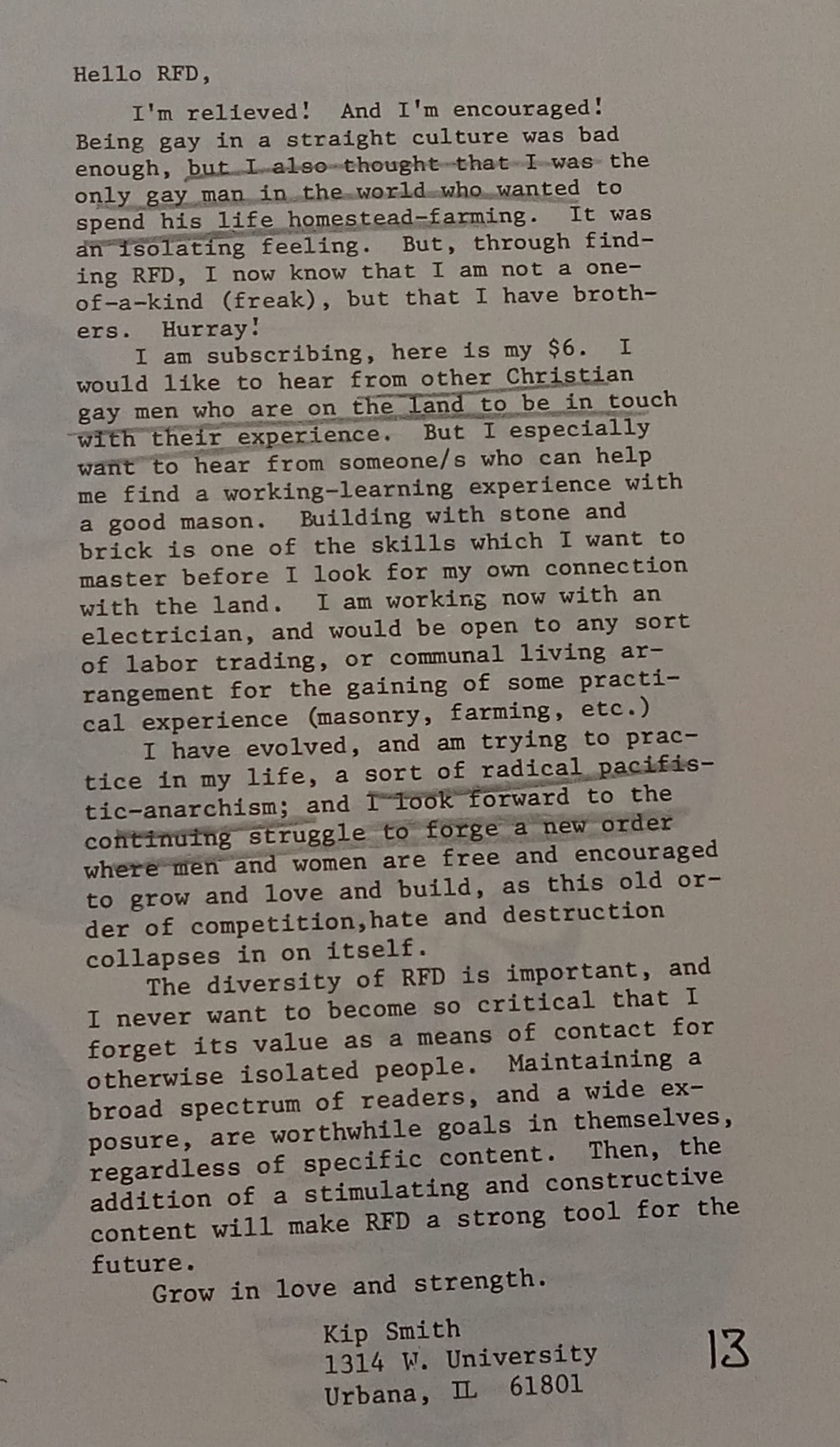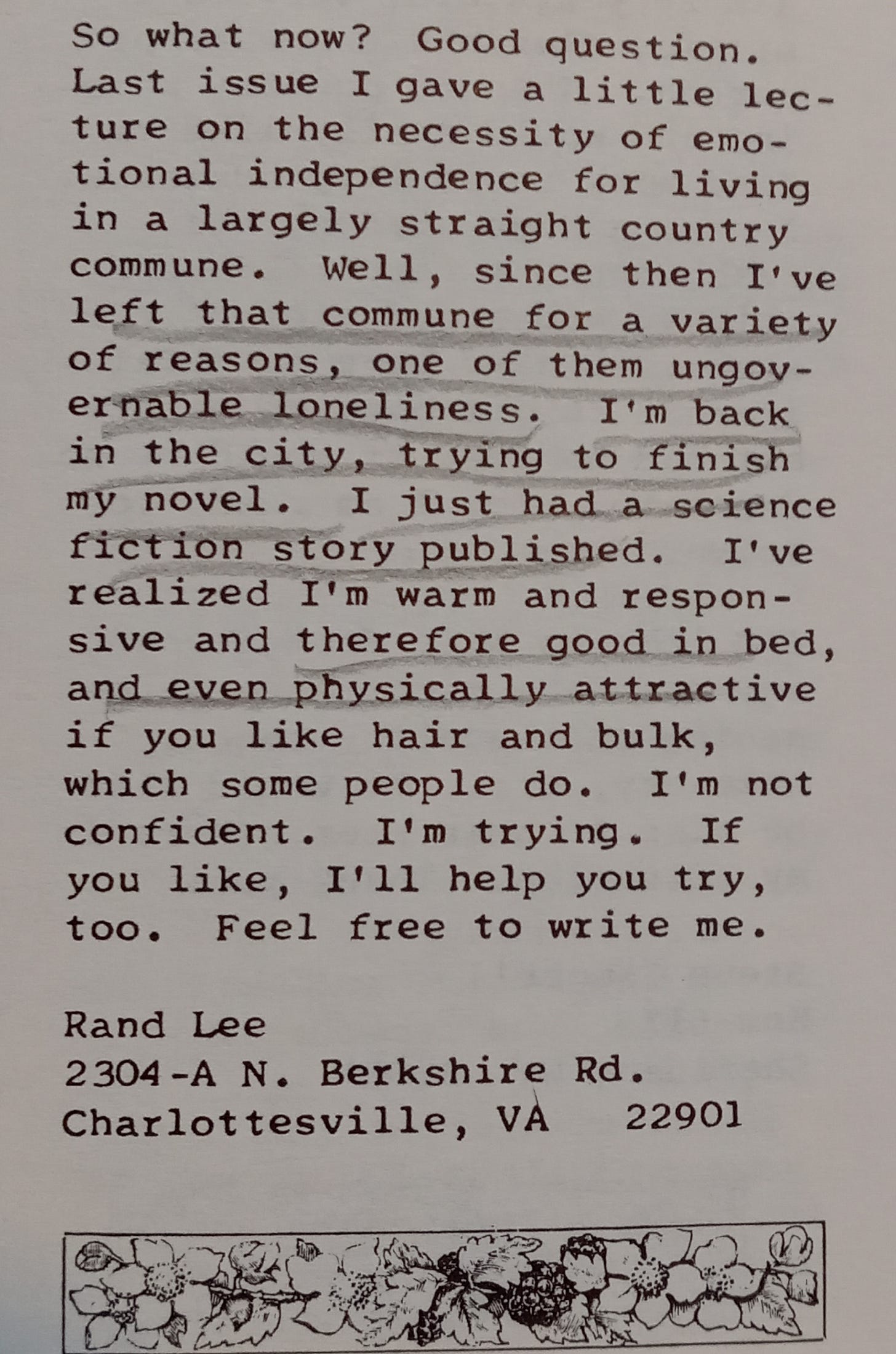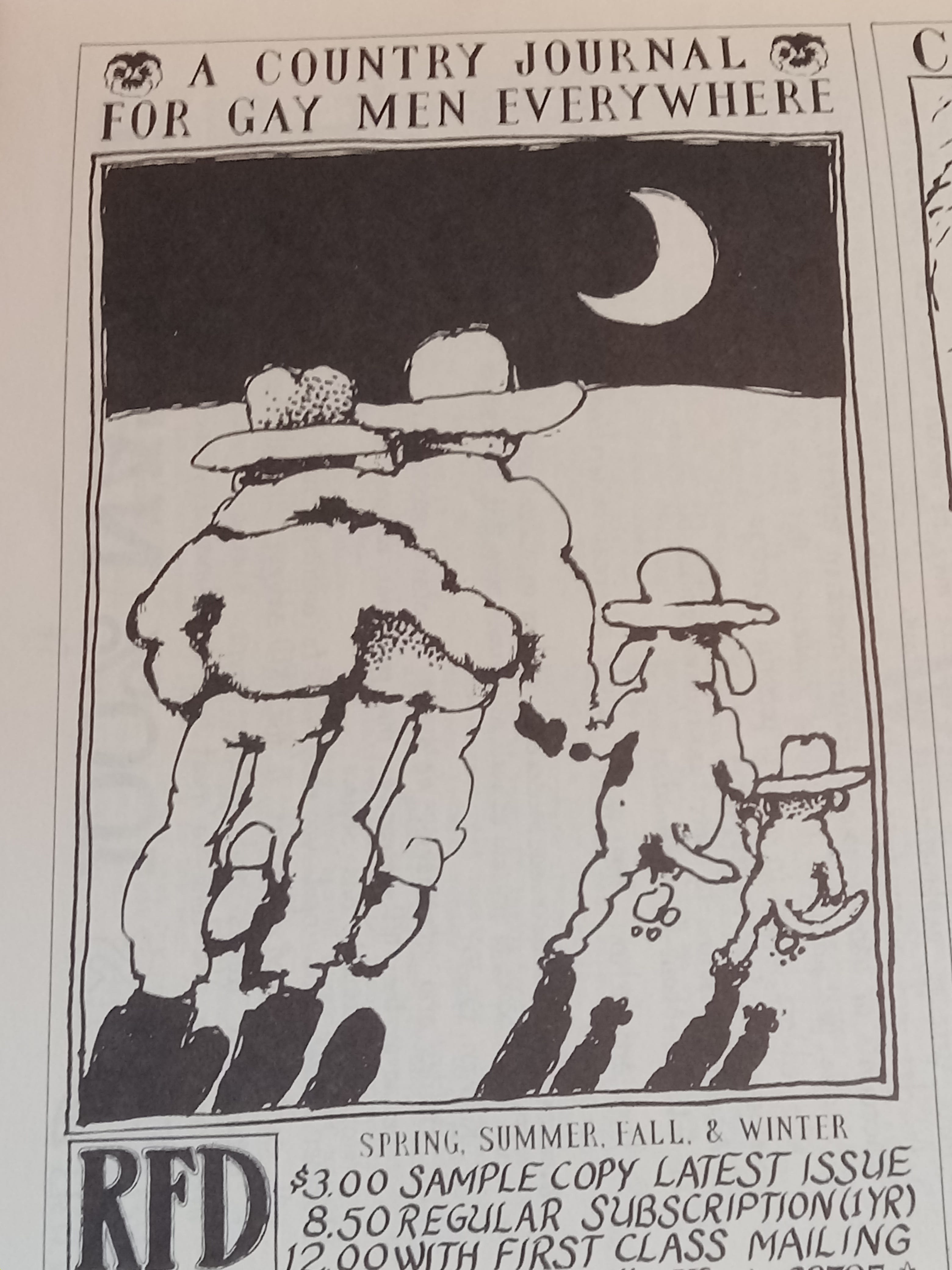 Which is why I got a few issues of RFD, a magazine for rural gays that became heavily inflected by Radical Faerie-ism, and present some choice bits here. They’re all from the period 79-82 (RFD seems to have not yet been aware of AIDS in that last year).