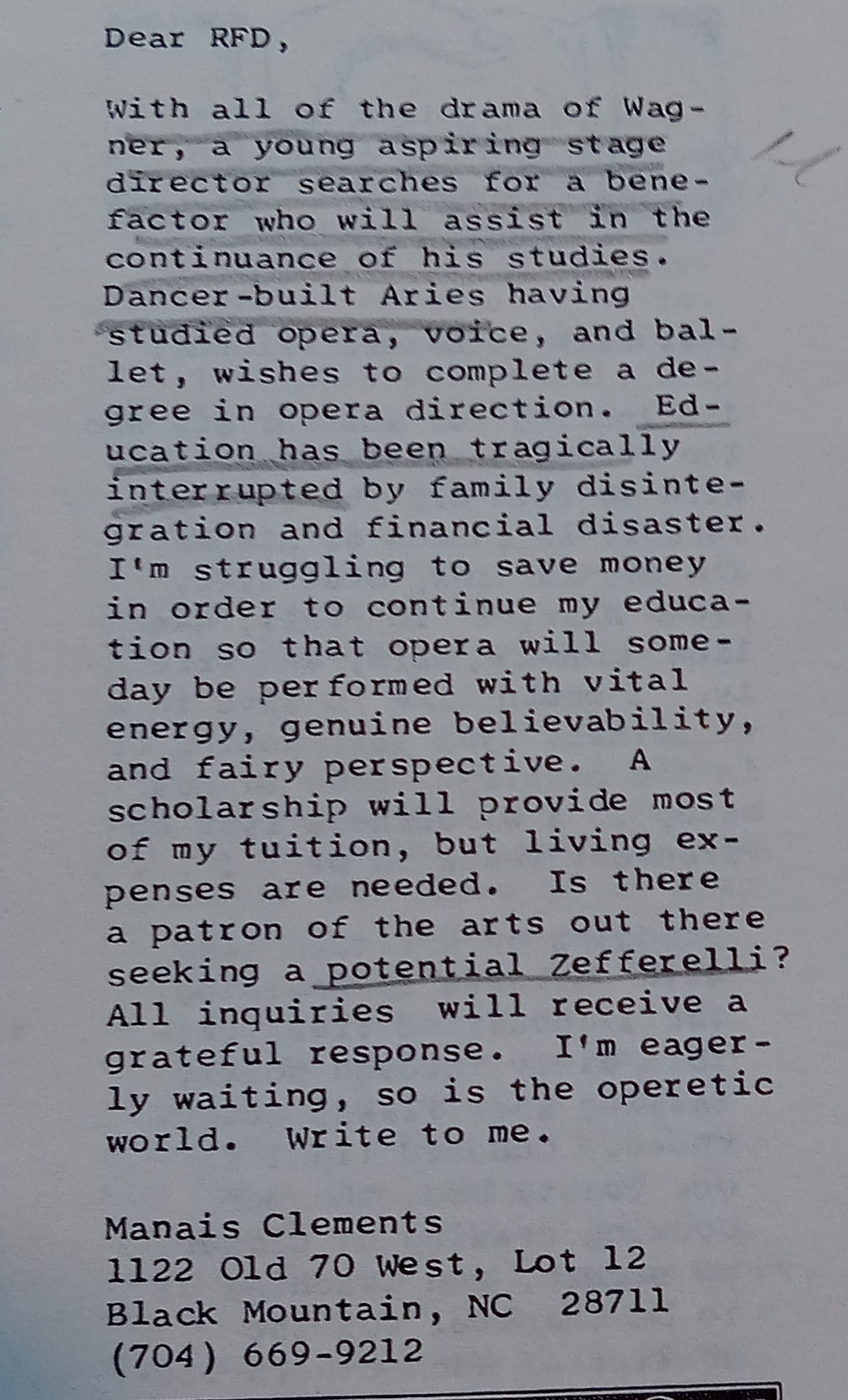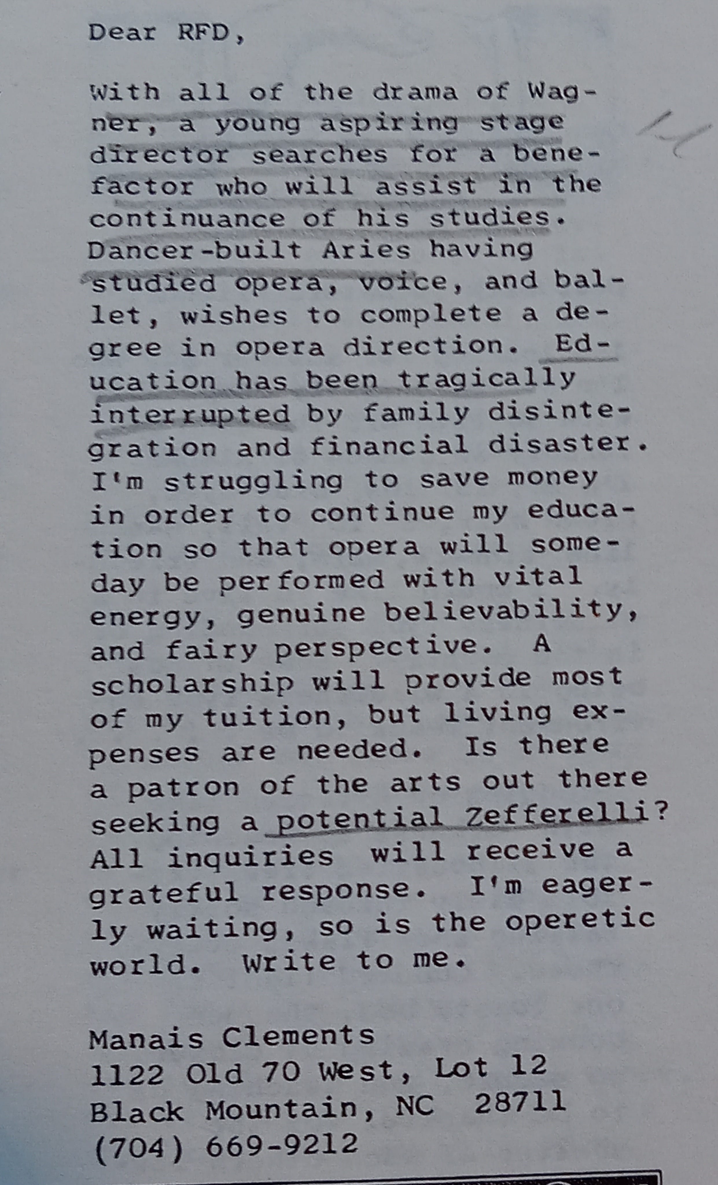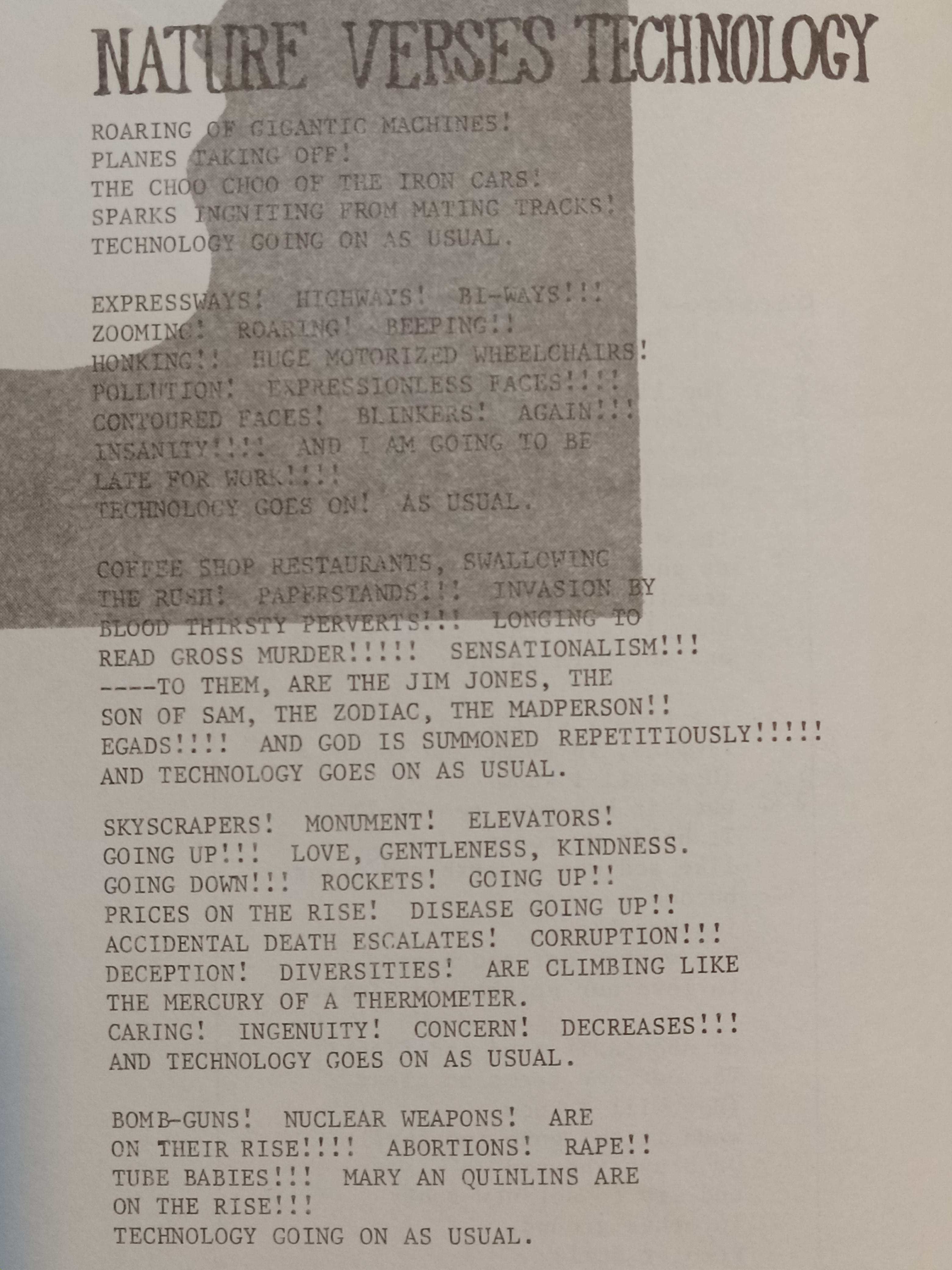 Which is why I got a few issues of RFD, a magazine for rural gays that became heavily inflected by Radical Faerie-ism, and present some choice bits here. They’re all from the period 79-82 (RFD seems to have not yet been aware of AIDS in that last year).
