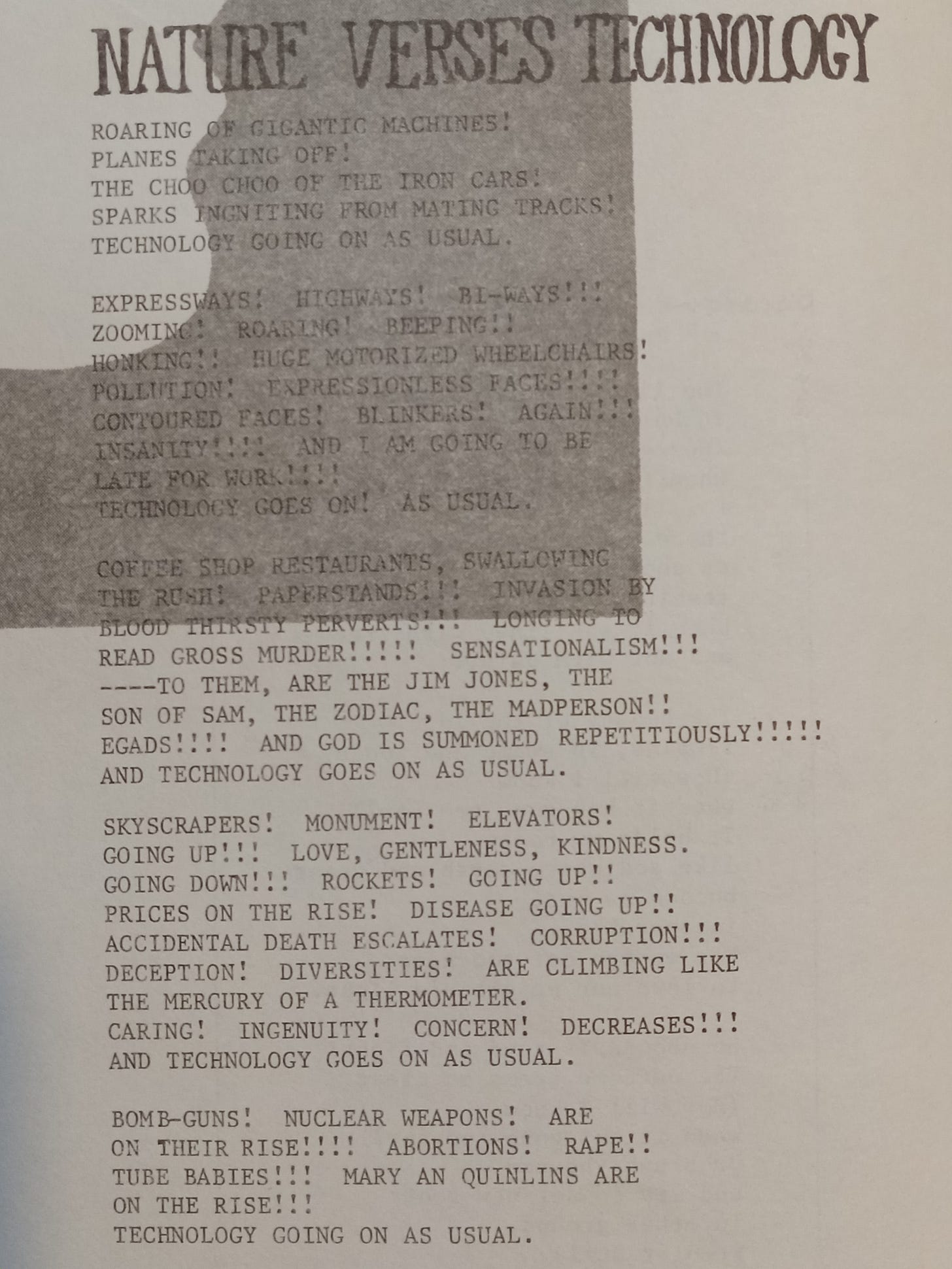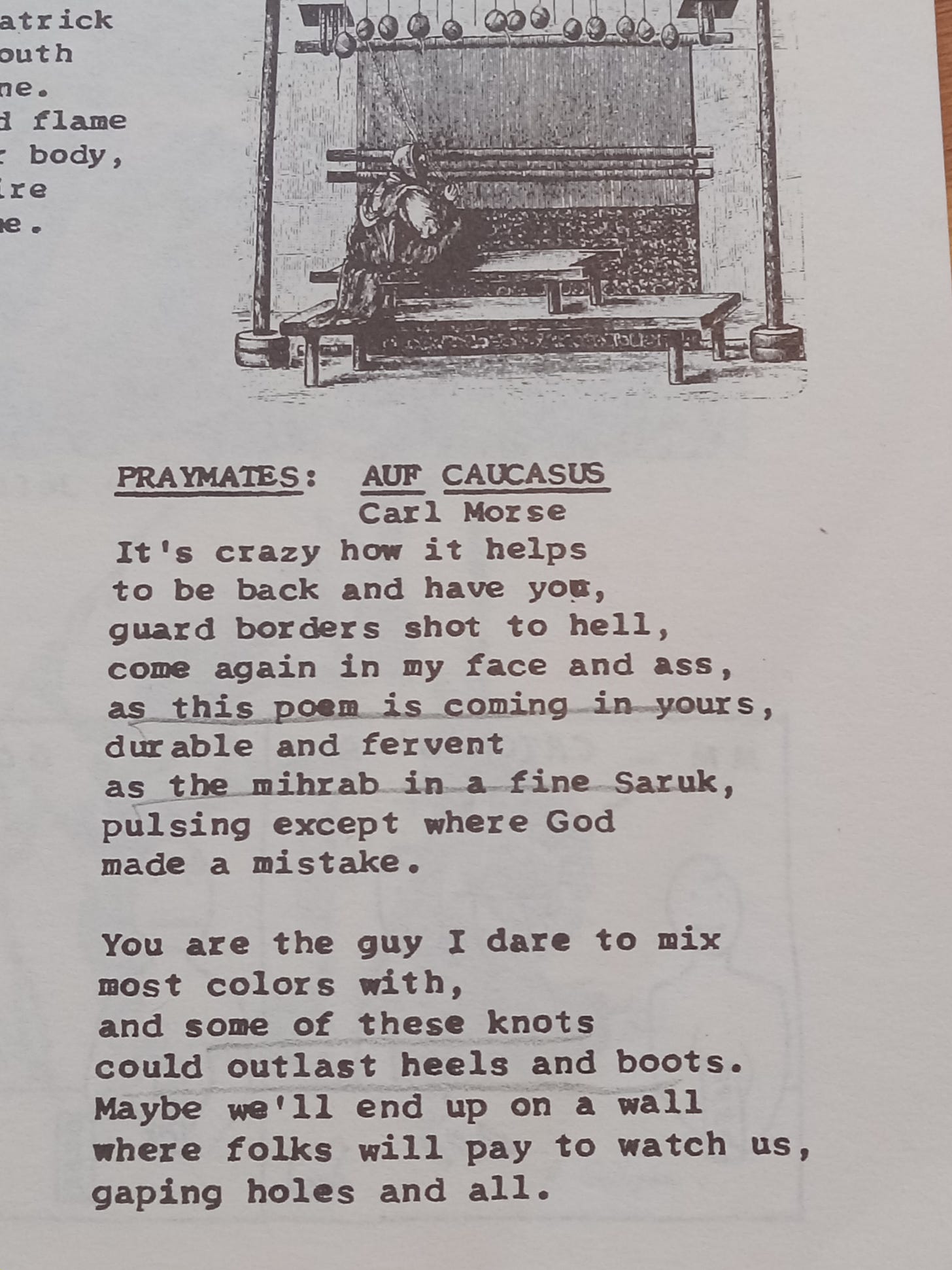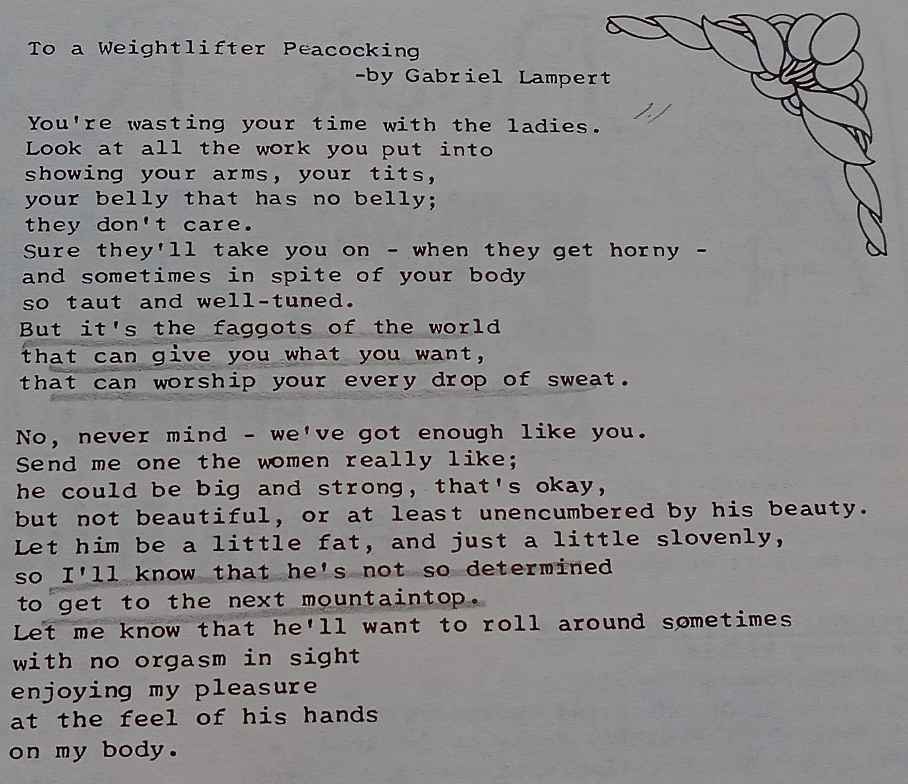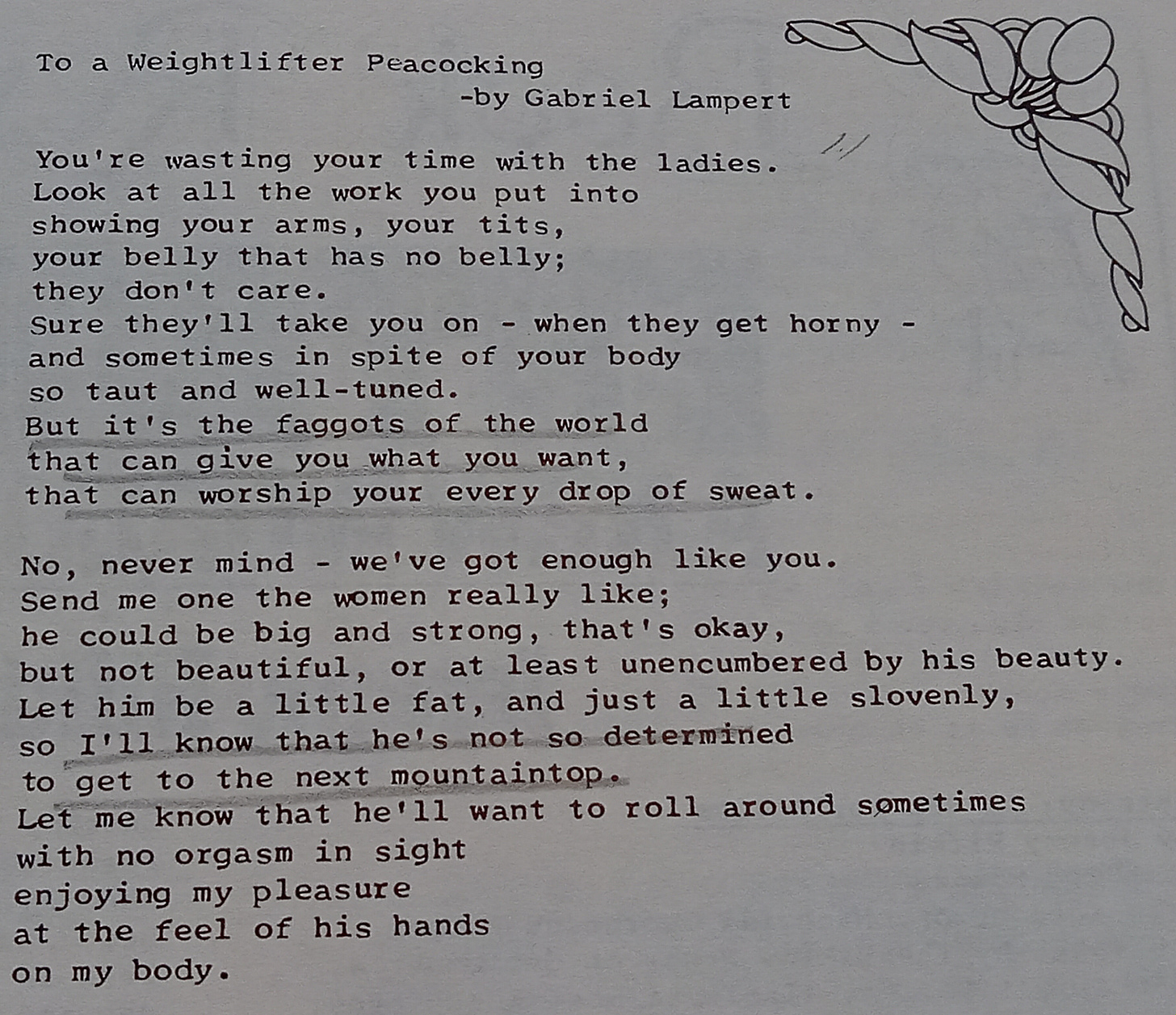 RFD also featured a lot of bad, earnest poetry. I’m actually headed in a few weeks to the University of Wisconsin to do some research in their gay poetry archive on this kind of bad poetry from the 70s—beyond the formally perfect poems of like, real poets like Thom Gunn, or the experimental post-avant-garde work of Ashbery, there was a huge amount of rightfully forgotten political/personal poetry in magazines like RFD, Fag Rag, and Mouth of the Dragon. But as with shit like Rupi Kaur or Yung Pueblo today (the only Instagram poets I know), I’m curious about where bad poetry comes from—what function is it imagined to serve, and why does it look the way that it does? how do people learn how to write the kind of bad poems they do? Anyway, here’s some: