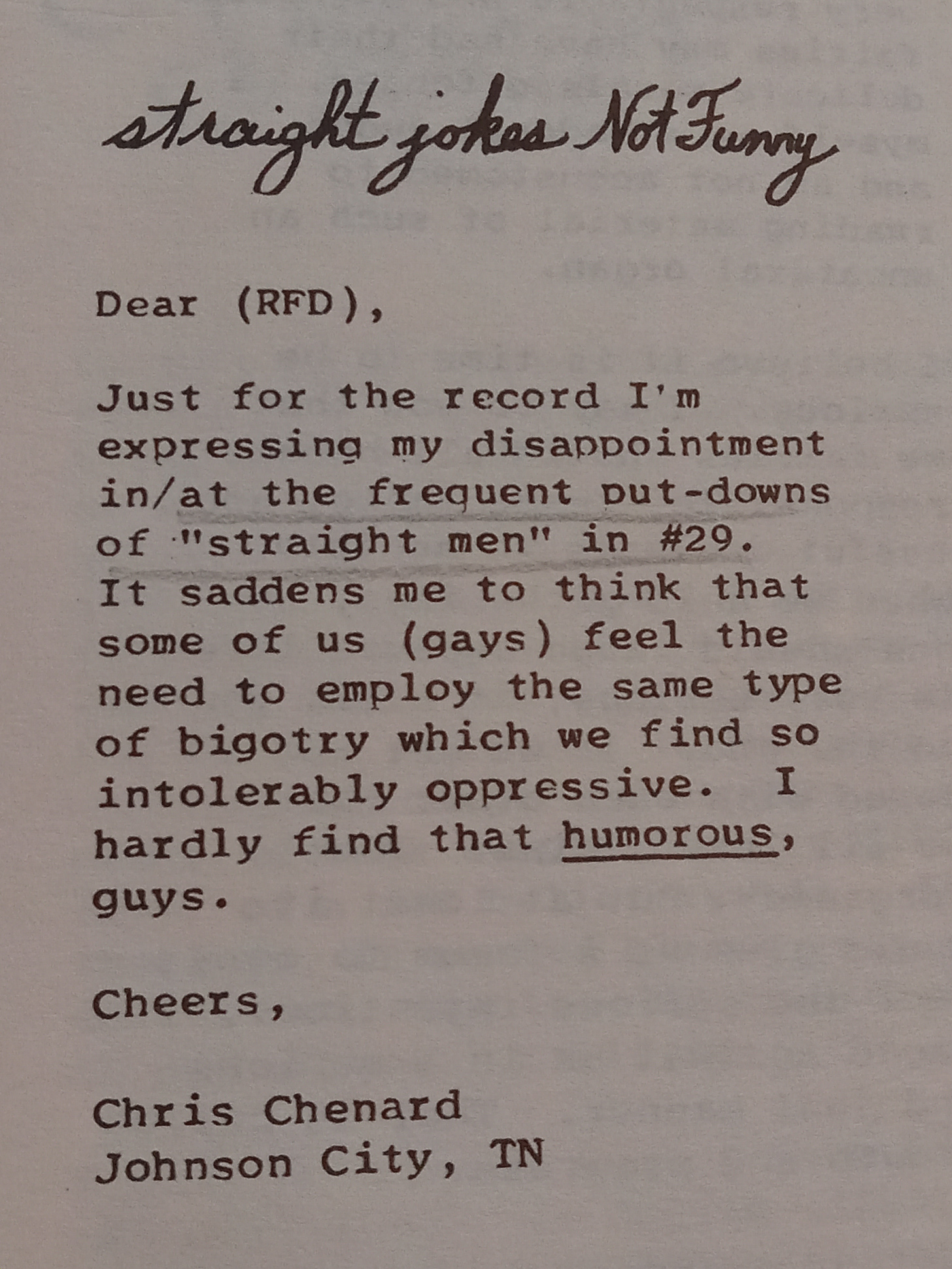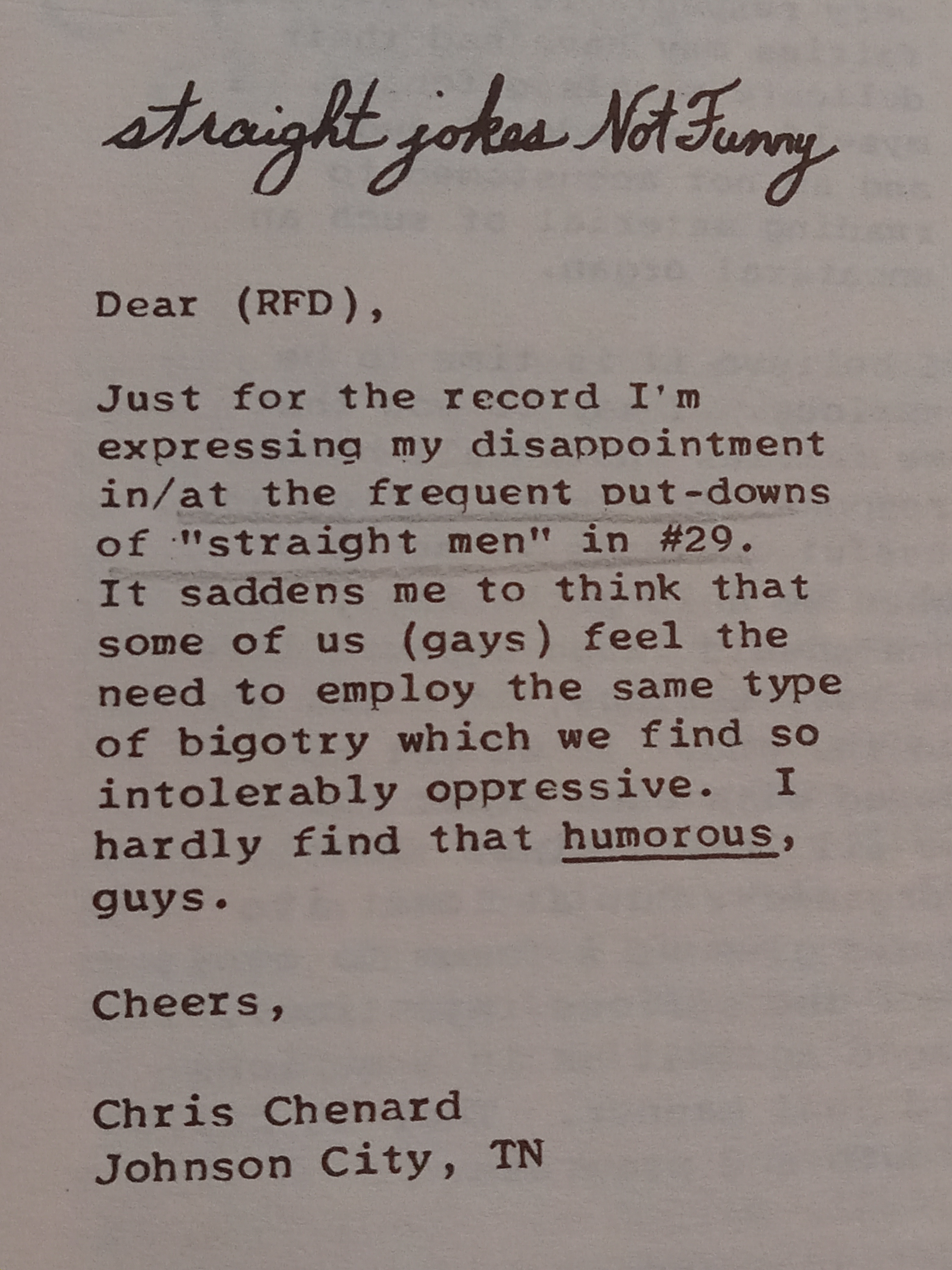 The real fun of any gay magazine, however, comes from the letters and personals: