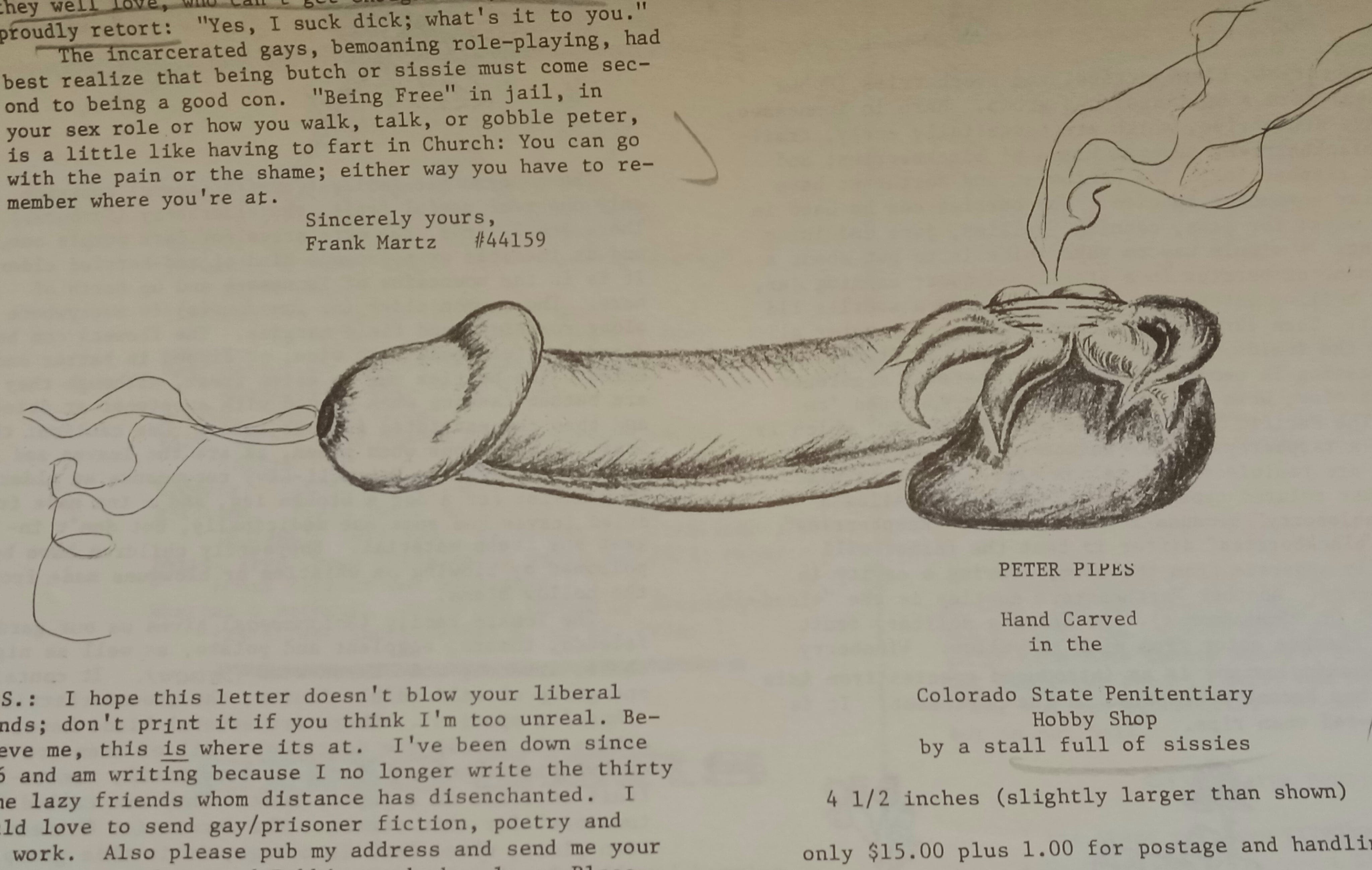 Importantly these stupid cock-bongs were made by incarcerated sissies; the magazine, like Fag Rag (which had a similar left-pagan-silly politics, but was based in Boston, not a country commune), put a lot of emphasis on reaching out to gay men in prison—featuring letters and articles from and about them (a topic what mainstream or even tediously woke gay/queer magazine now would devote a monthly feature to?).